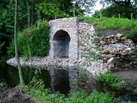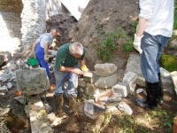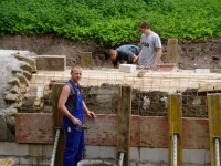 Auf die Schalung wurde die Bruchsteine als Rundbogen aufgeschichtet, die ersten Zentimeter der Fugen wurden mit Sand aufgefüllt und dann eine Betonschale übergestülpt.